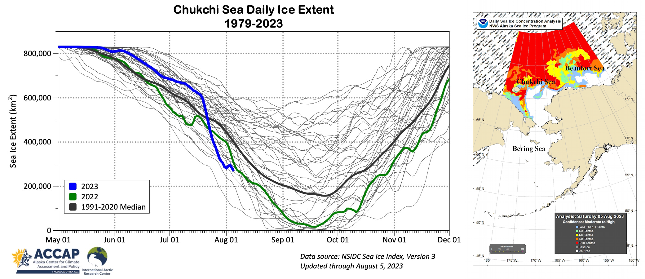 Sea ice extent in the Chukchi and Beaufort Seas has not changed much in the past week in NSIDC data as ice melt has slowed and moderate concentration ice is pushed around by the winds. Chukchi #SeaIce extent is well below the 1991-2020 median and is sixth lowest of the past 45 years for this point in the season.