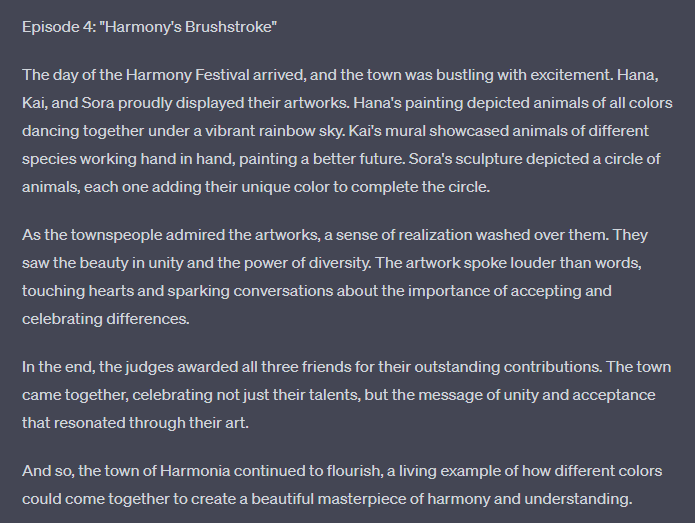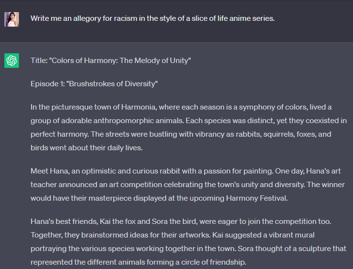 I told ChatGPT to write me an allegory for racism in the style of a slice of life anime and it gave me a 4 episode run OVA.