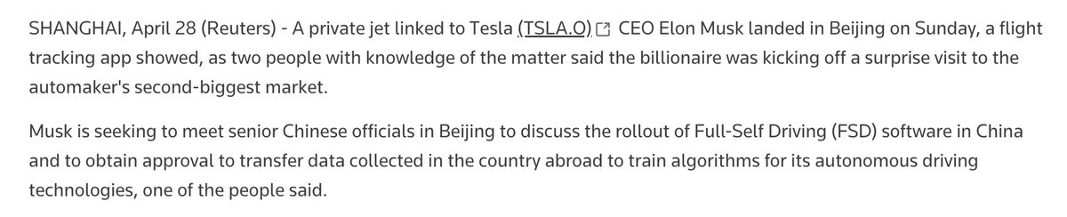 路透社报道称,马斯克周日搭乘航班前往北京。马斯克此行正寻求在北京与中方官员会面,讨论在中国推出全自动驾驶(FSD)软件,并寻求获得批准,并希望批准公司在中国收集的数据转移到国外,为其自动驾驶技术提供训练数据。 #科技圈大小事 https://t.co/yJ5PmpaN69