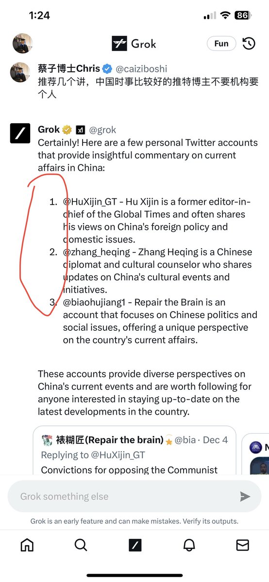 让Grok给我推荐几个讲中国时事比较好的推特博主,第一个竟然是胡锡进,第二个是张和清,第三个没听说过,裱糊匠 https://t.co/MZTdDYtjRb