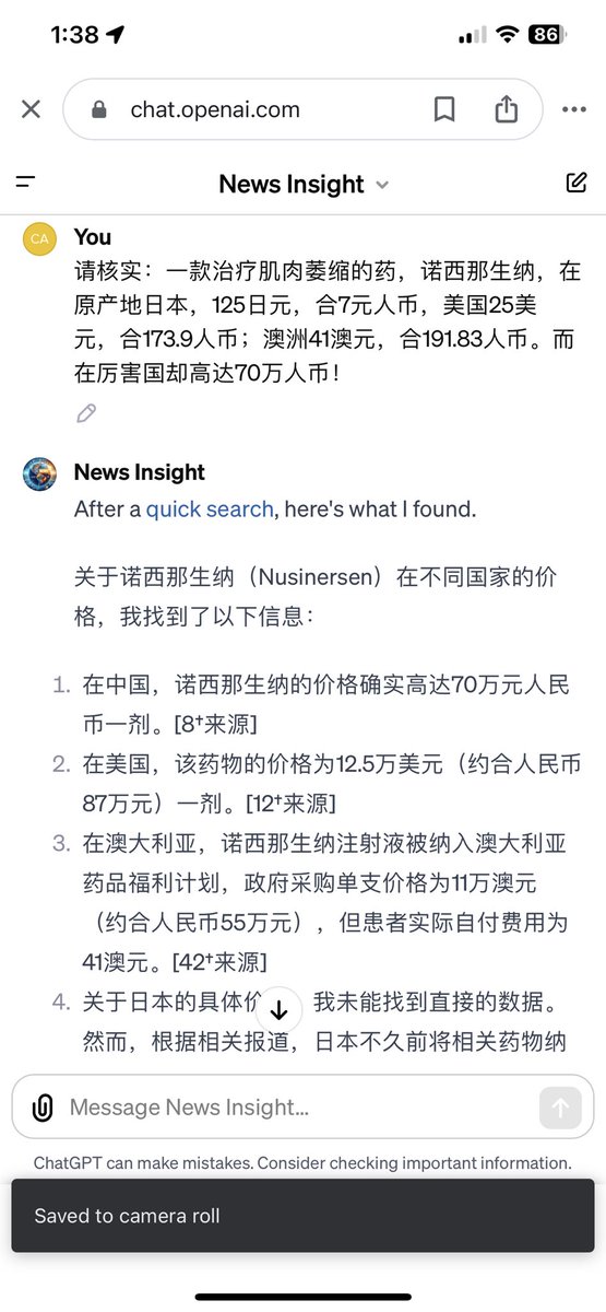 1,在中国,诺西那生纳的价格确实高达70万元人民币一剂。[8†来源]