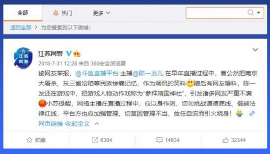 2018年7月31日,一段2016年陈一发儿直播的视频突然在网上广泛流传。在这段视频中,陈一发儿讨论了南京大屠杀和东三省沦陷的话题,把这些痛苦的历史事件当作笑料。她还在游戏中将一个角色的动作称为“参拜靖国神社”。这些评论引起了公众的愤怒,导致直播平台斗鱼发布了一份官方声明,禁止了陈一发儿的直播间。他们还将此事件报告给相关部门,按照国家法律法规进行处理。事件发生后,陈一发儿在微博上拥有超过385万粉丝的账户被取消,并且她的作品被从QQ音乐、网易云音乐和酷我音乐等多个音乐平台上移除。她后来在微博上为她在视频中的言论和2010至2011年期间在微博上发表的不当评论道歉。