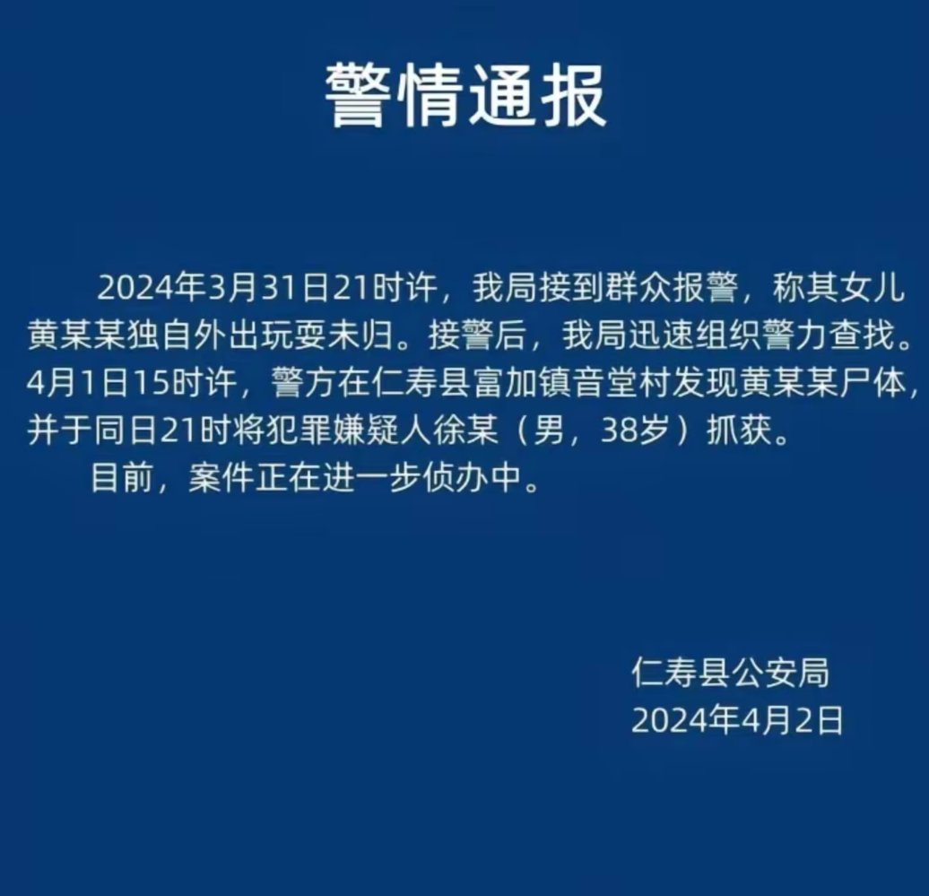 3月31日,四川眉山仁寿县。一名11岁的小女孩离家找同学途中遇害。4月1日下午,警方在湿地公园一处房屋后山找到遗体,同日21时,犯罪嫌疑人徐某(男,38岁)被警方抓获。