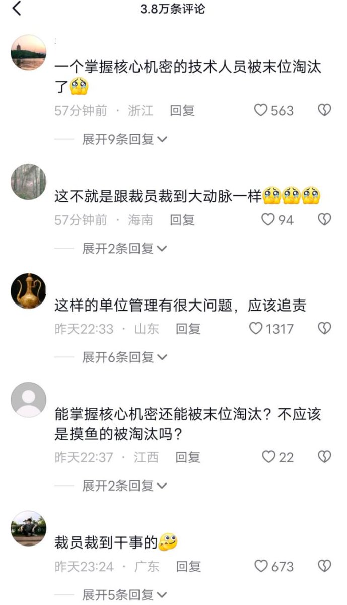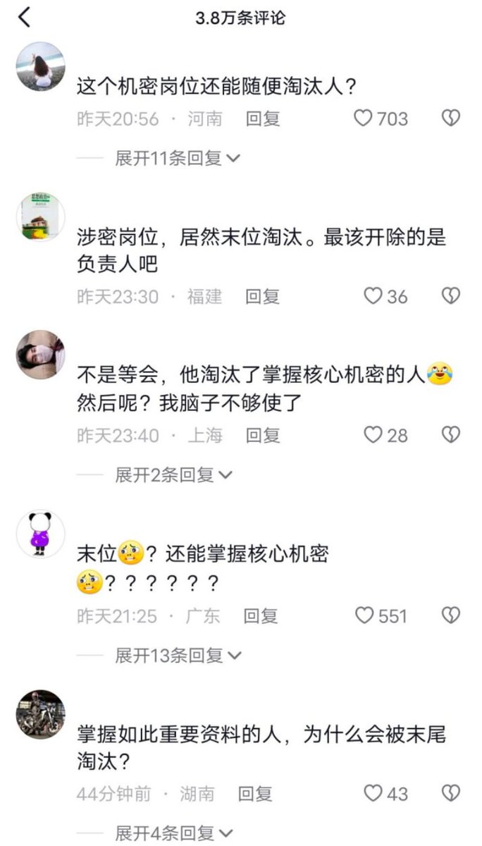 该新闻却引发了不少网友的共情。质疑为什么掌握核心机密的人会被末位淘汰。 https://t.co/ad8NHmvcSJ