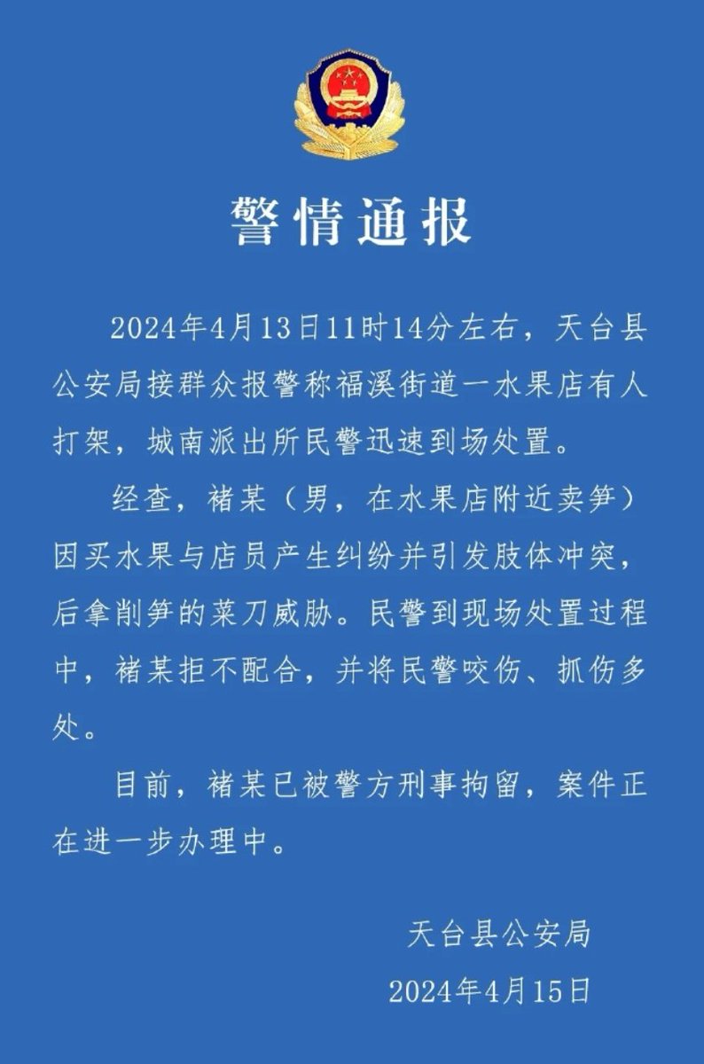 15日,天台县公安发布通报,男子褚某与水果店店员发生纠纷后拿菜刀威胁,民警在现场处置过程中褚某拒不配合,并将民警咬伤、抓伤。目前,褚某已被刑拘。 https://t.co/z1zy8GvPtd