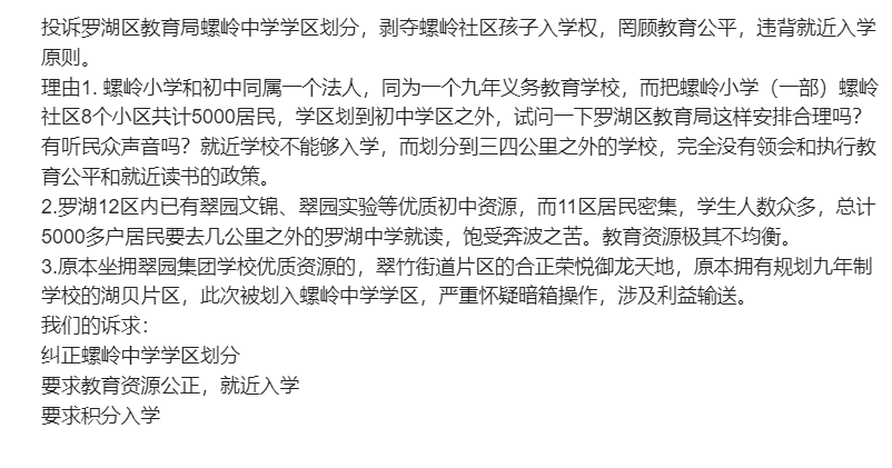 4月16日深圳螺岭社区家长在罗湖区政府前抗议学区划分未按就近原则分配。