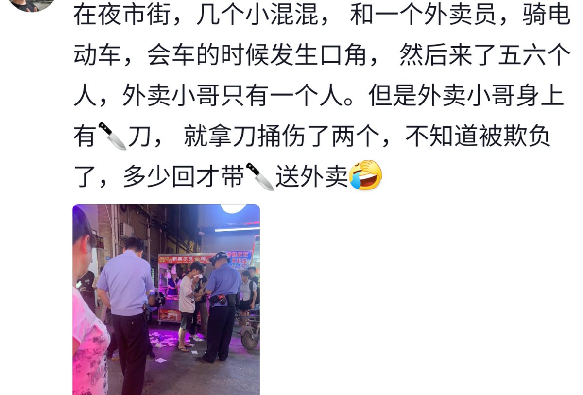 据知情者称,当晚一名外卖员和一男子发生口角,随后男子又叫了好几个人,而外卖员则掏出了随身携带的刀,并捅伤了两名男子。 https://t.co/avBfpVssqh