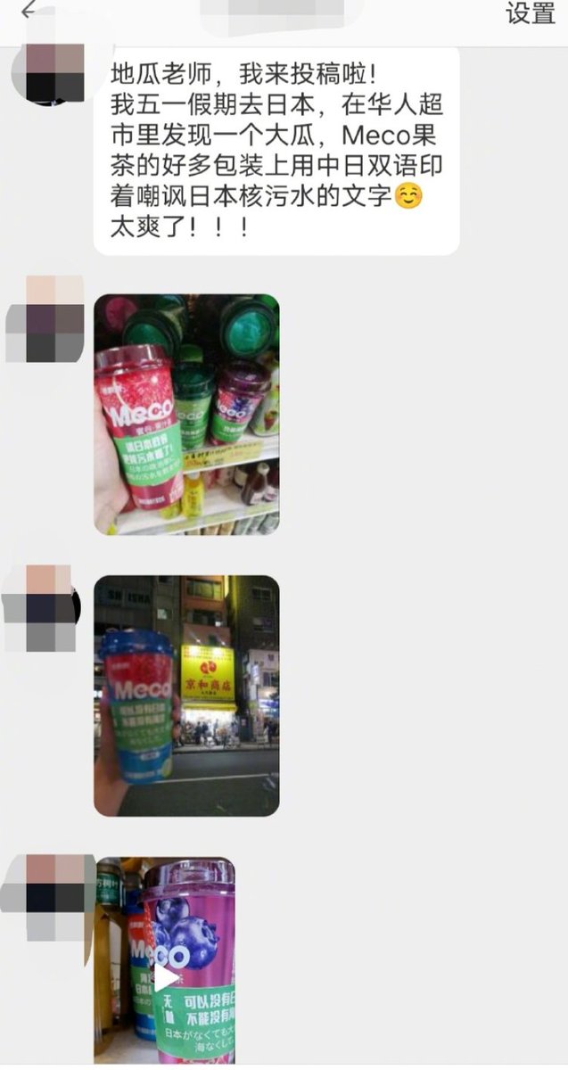 5月3日,博主“地瓜熊老六”称,有游客向他投稿,在日本的华人超市中发现香飘飘Meco的包装上面分别用中文和日文印着“可以没有日本,不能没有海洋”“请日本政客把核污水喝了”等字样 https://t.co/NWqeY4X2Ba