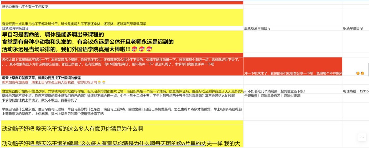 5月8日晚,常州工学院外国语学院的学生们在学院的意见收集文档中集体抗议学院的早晚自习政策。 https://t.co/6u9VzxGzRq