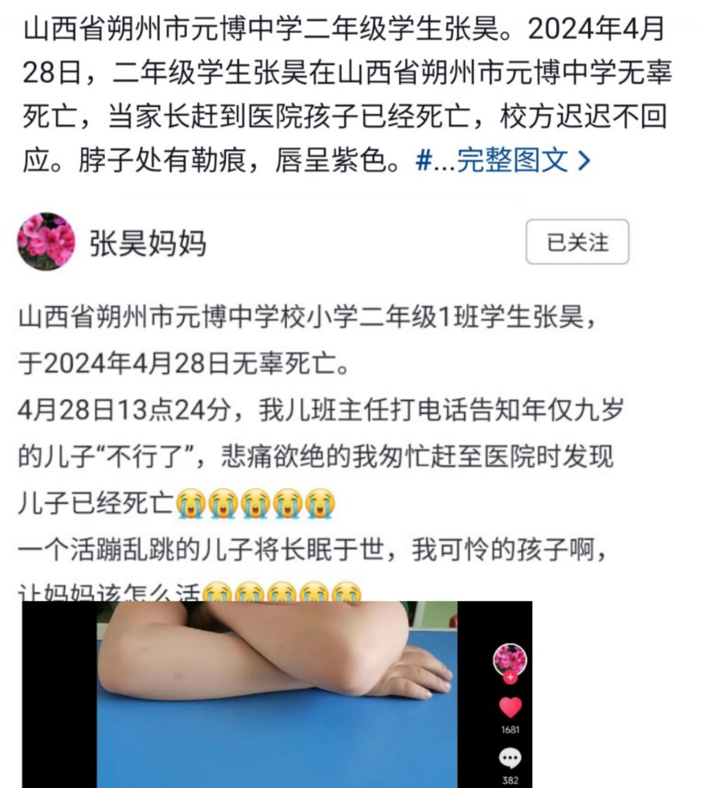 5月9日,山西朔州。一女子发视频称,自己的孩子就读元博中学二年级,4月28日接到班主任电话得知孩子出事。赶到医院后被告之孩子已死亡,其脖子处有很深的勒痕。