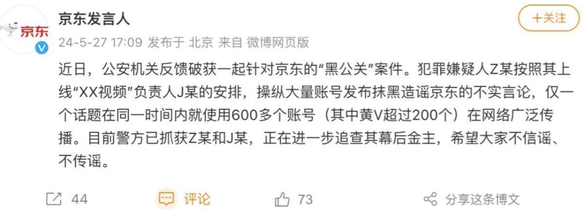 5月27日,京东称近日公安机关破获了一起针对京东的“黑公关”案件。希望大家不信谣不传谣。 https://t.co/jbw35qsJTm