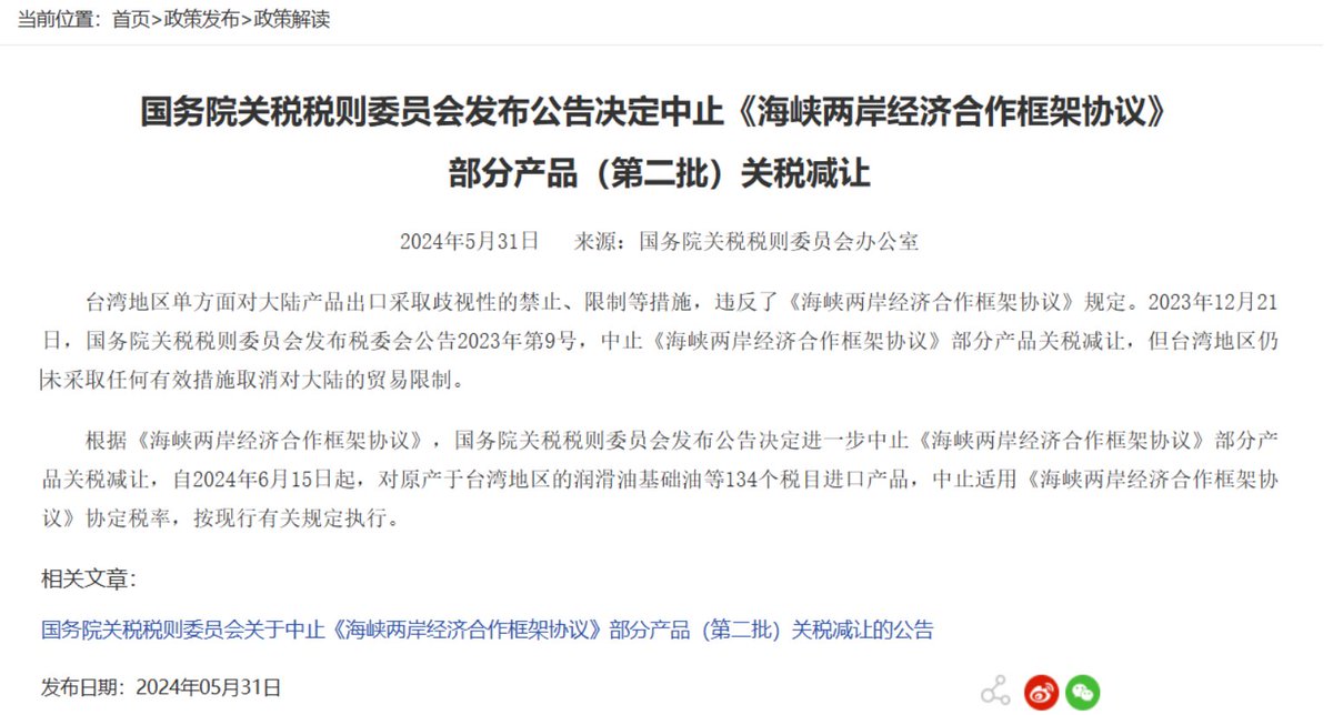 5月31日,国务院关税税则委员会宣布:自2024年6月15日起,对原产于台湾地区的附件所列润滑油基础油等134个税目进口产品,中止适用《海峡两岸经济合作框架协议》协定税率,按现行有关规定执行。 https://t.co/LyBzm5TWtY