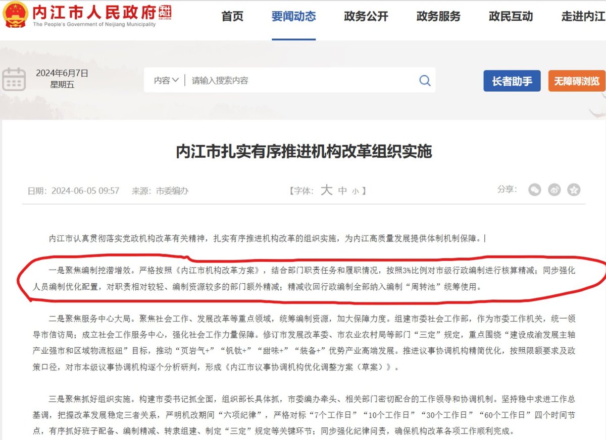 四川内江近日发布消息称,按照3%的比例对市级行政编制进行核算精简。