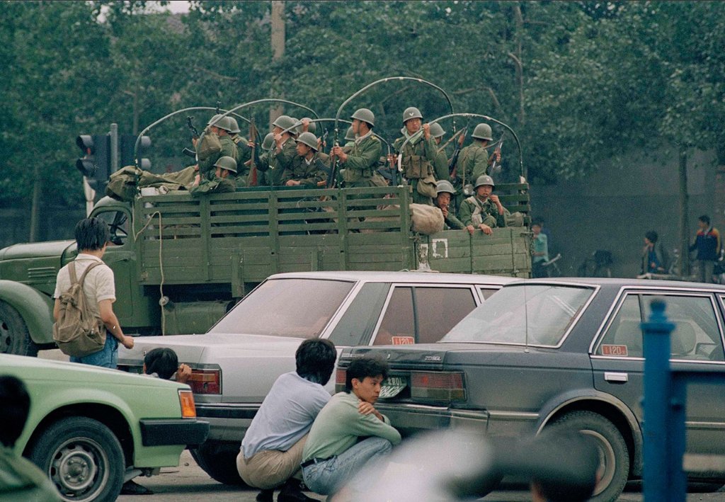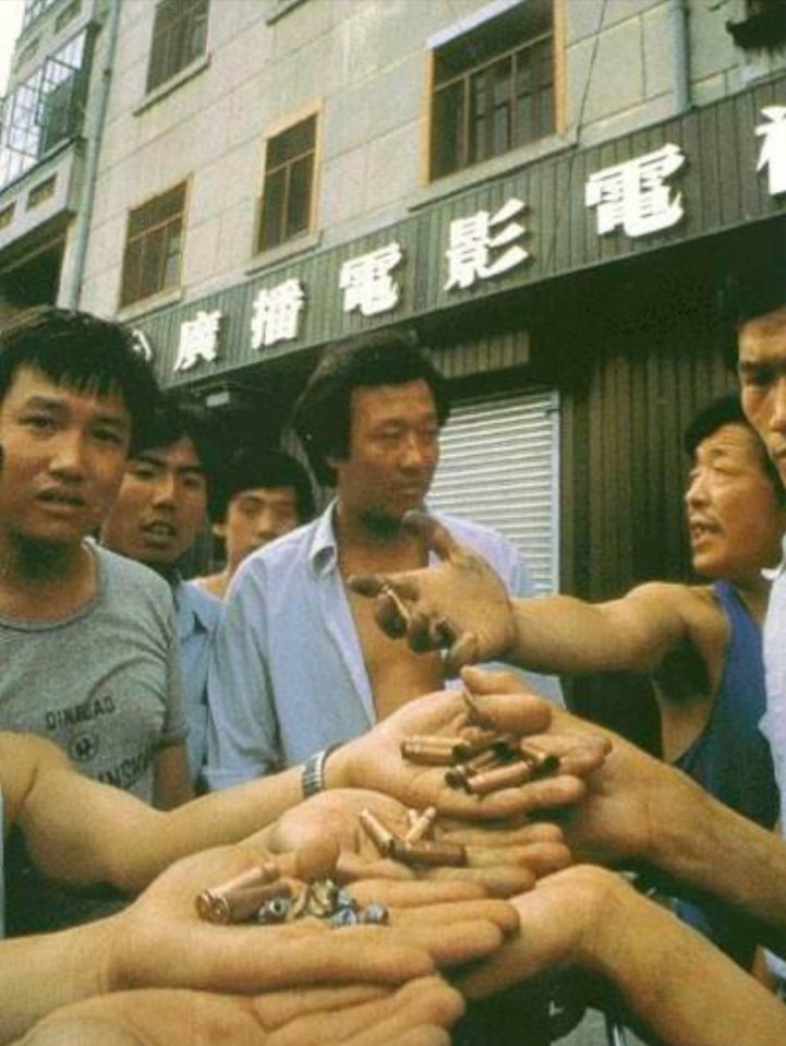 1,一辆满载士兵的卡车经过街头,有市民躲在汽车后以防士兵扫射。2,镇压过后,一些市民展示他们在街头拾到的弹殻。3,燕京饭店的外墙上留下密集的弹孔。4,数万广州学生和市民在珠江大桥一侧抗议北京镇压学运。