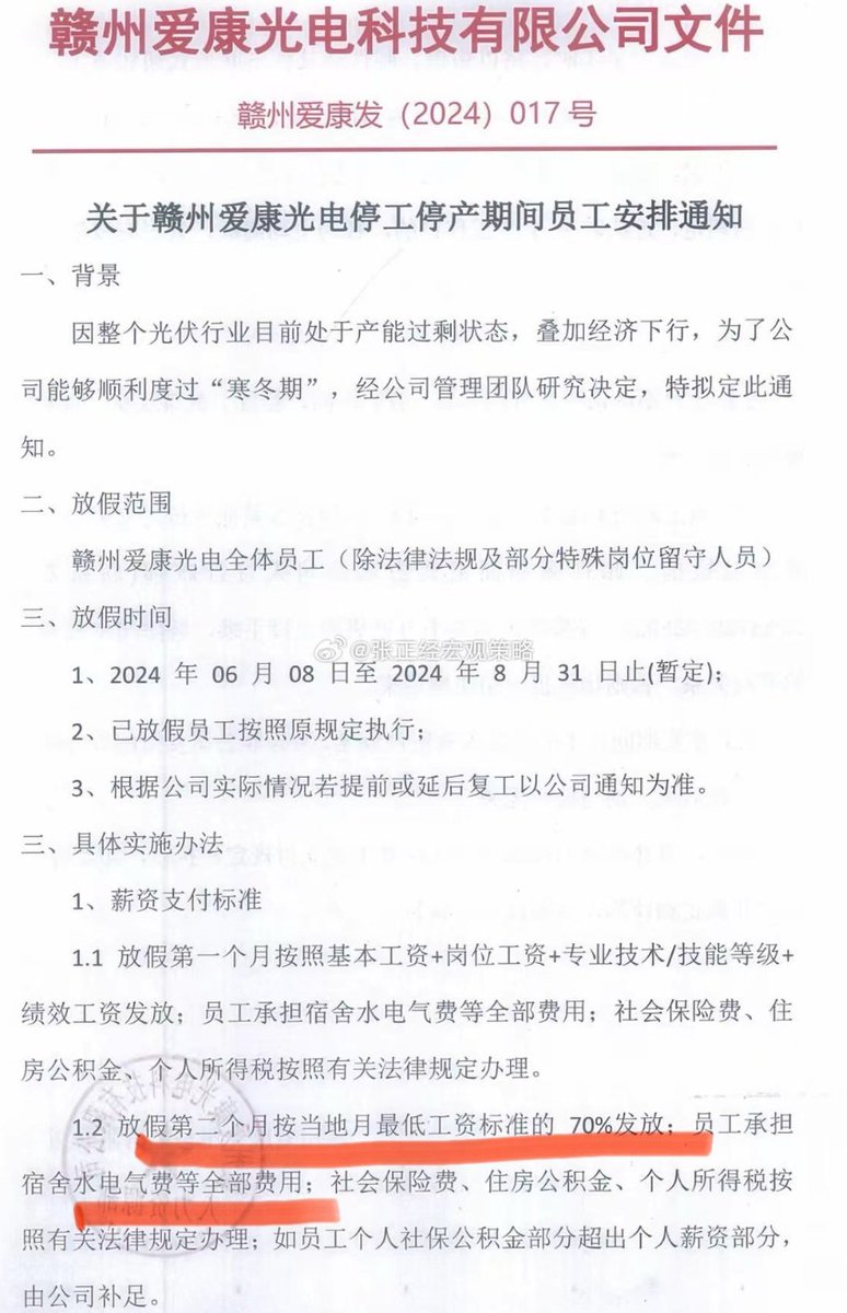 6月9日,网传赣州爱康光伏科技有限公司的文件称,由于整个光伏行业目前产能过剩,公司决定停工停产。停工第二个月工资按最低工资标准的70%发放,员工需要承担宿舍水电气等全部费用。