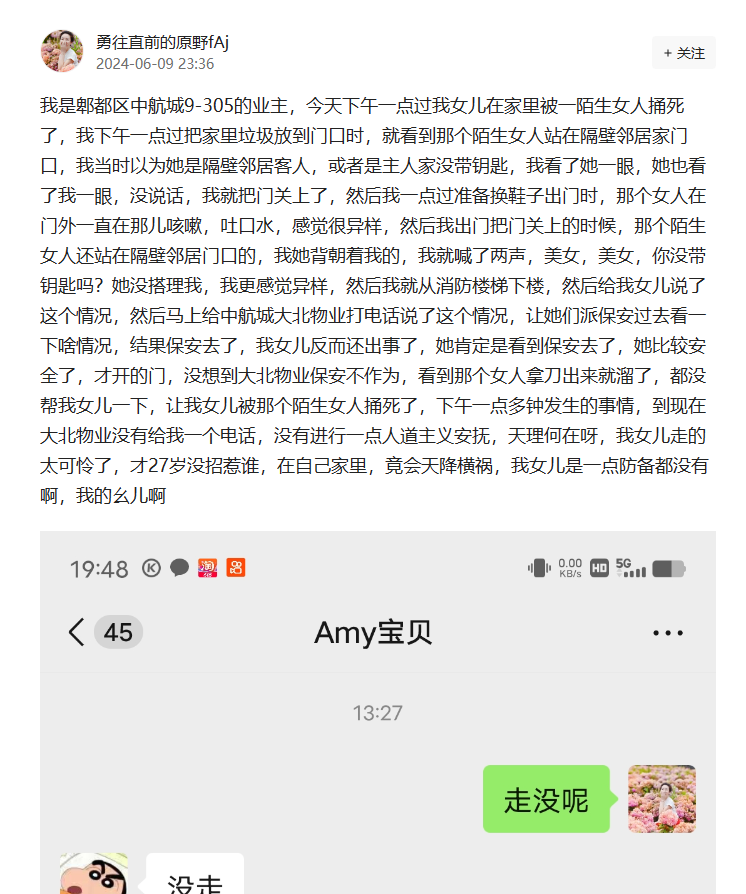 6月11日,四川成都。家住郫都区中航城小区的王女士反映称,6月9日下午,她27岁的女儿小雅在自家屋内,被一名不相识的年轻女子杀害。而当时小区物业保安就在现场,却没有即时制止。对女儿的不幸遇害,王女士十分悲伤,她希望法律严惩凶手。同时,她认为物业保安不作为,也应对此承担一定的责任。 https://t.co/6cbrAejo9M