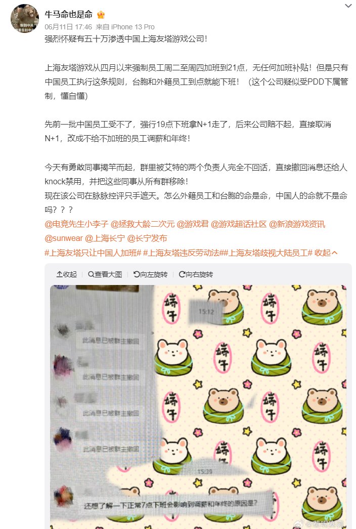 近日,网传上海友塔游戏从四月以来强制员工周二至周四加班到21点,无任何加班补贴,但是只有中国员工执行这条规则,台湾员工和外籍员工例外。