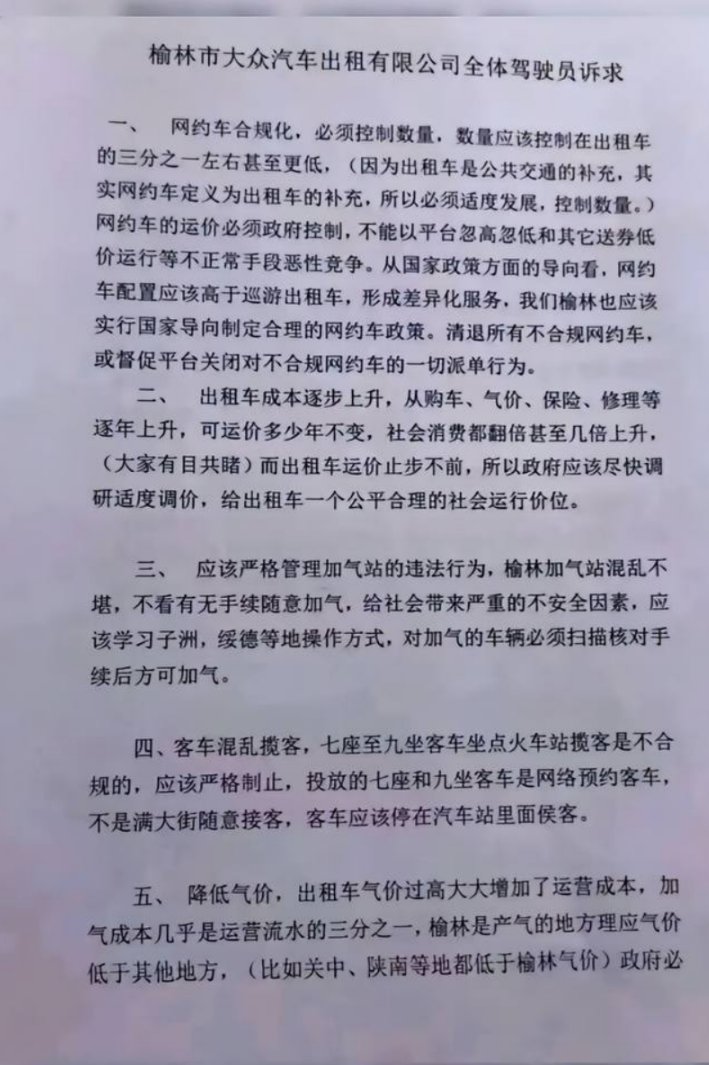 6月14日,榆林出租车司机集体罢工,并提出五大诉求。包括要求网约车合规运营,提升运价,整治加气站违法行为,客车混乱揽客,降低气价等。