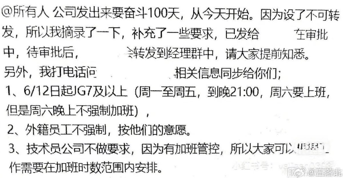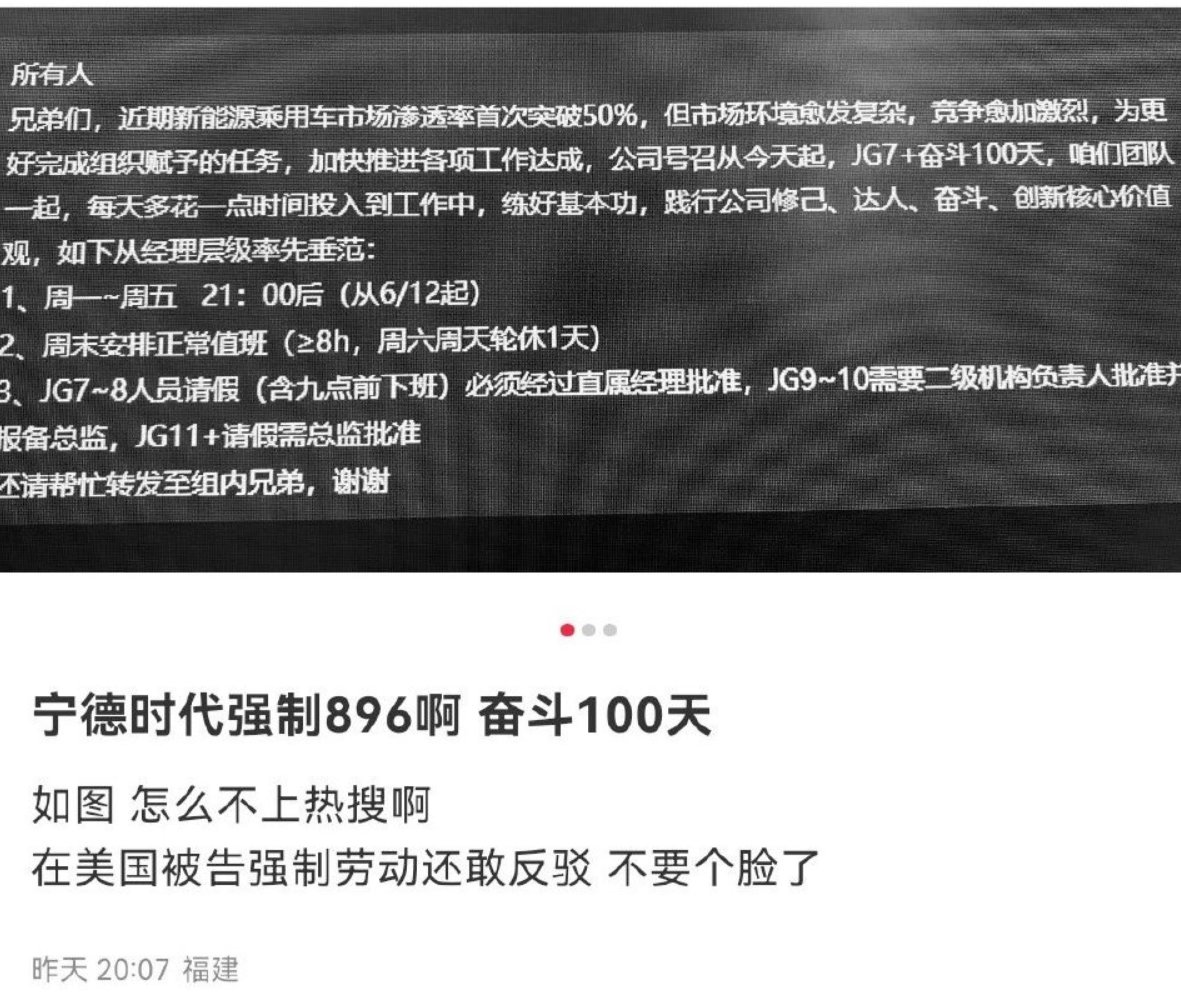 近日,网传宁德时代宣布JG7+以上员工自6月12日其强制实行896工作制奋斗100天,而外籍员工不强制。 https://t.co/8d8Qwe0D92