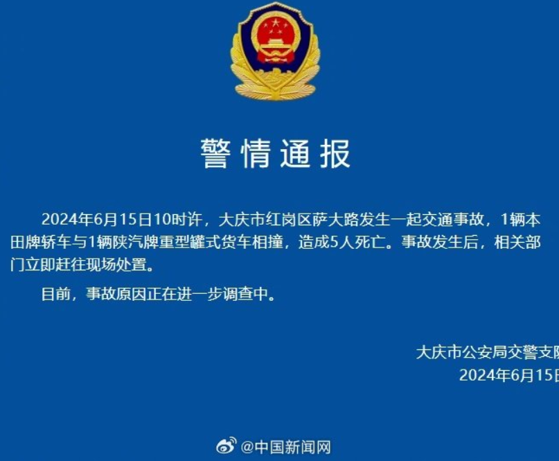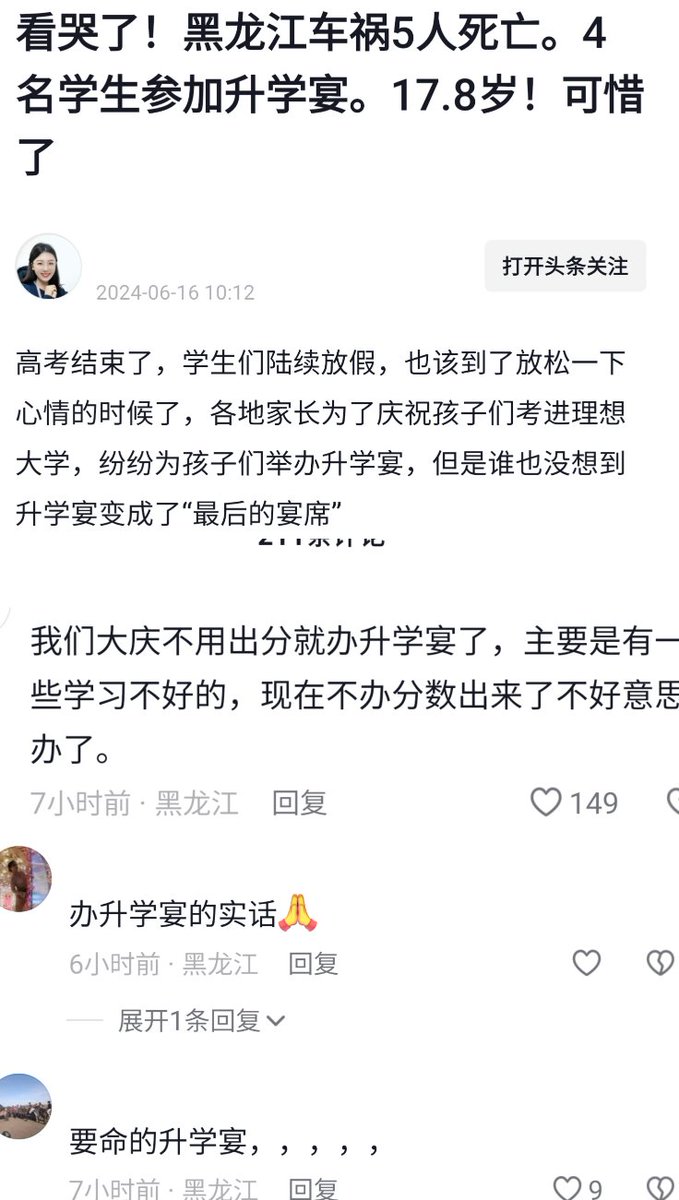 6月15日,黑龙江大庆市。红岗区萨大路发生一起交通事故,一辆轿车与一辆货车相撞,造成5人死亡,网传其中有4人是高考生,高参加完升学宴。 https://t.co/n4ufXEkJaJ