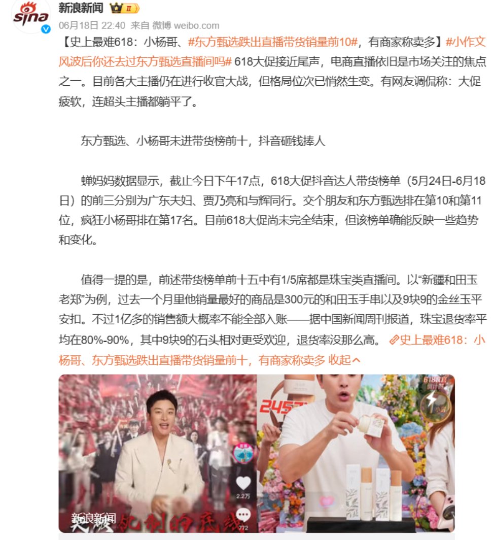 6月19日,据报道,今年618电商节小杨哥、东方甄选未进销量榜前十名,各方参与者都表现出一种“竭力感”。