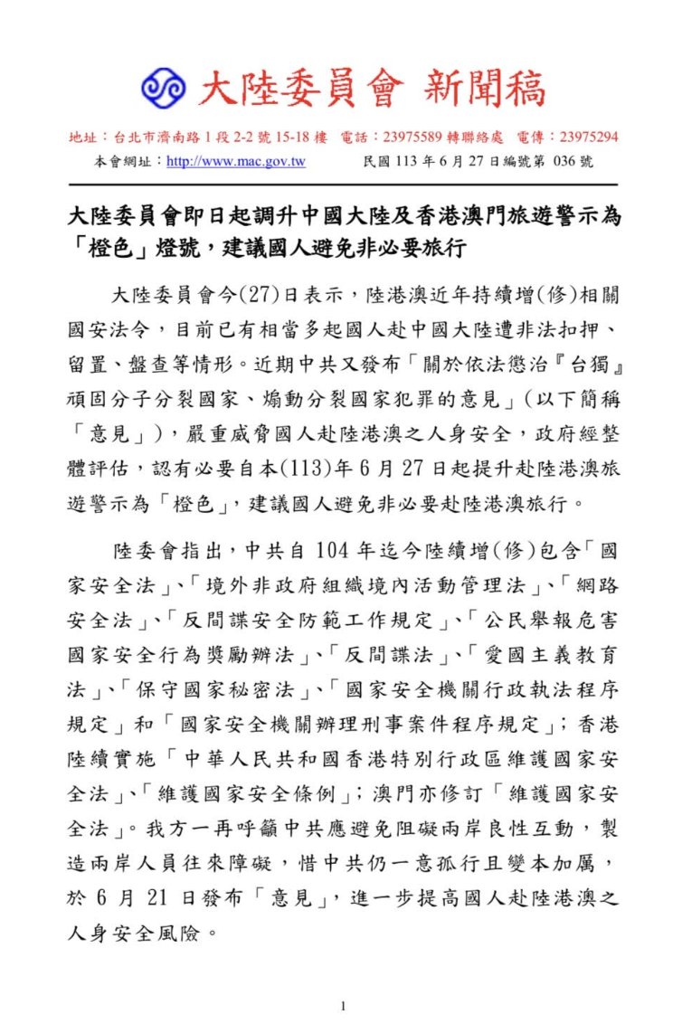 6月27日,台湾陆委会宣布,即日起上调赴陆港澳旅游警示为“橙色”,建议台湾民众避免非必要赴陆港澳旅行。 https://t.co/A7MKI5HgsM