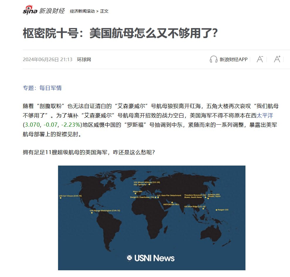 6月26日,人民日报/环球网皮下马甲枢密院十号领衔发文:“无法自证清白的艾森豪威尔号航母狼狈离开红海,美国航母怎么不够用了”。 https://t.co/hVuQAACCwW
