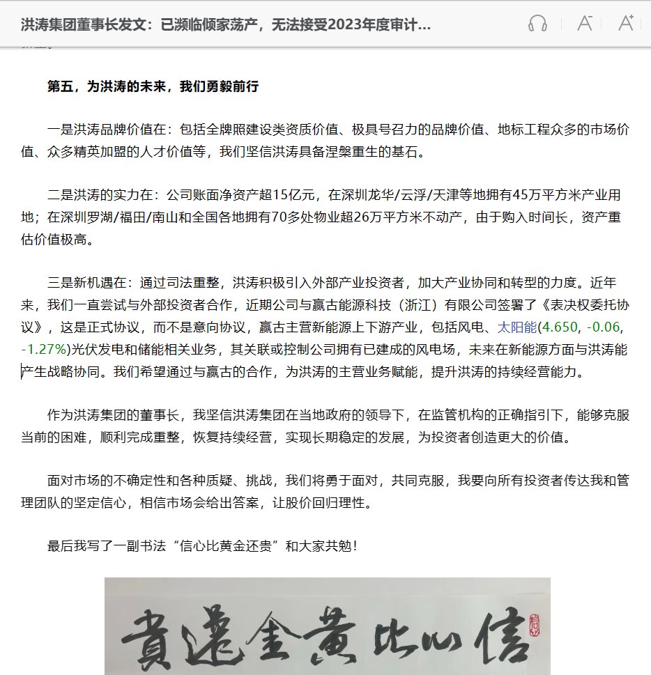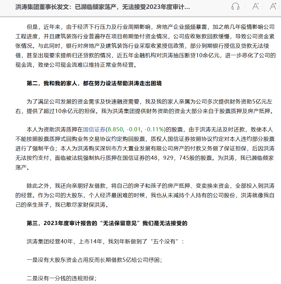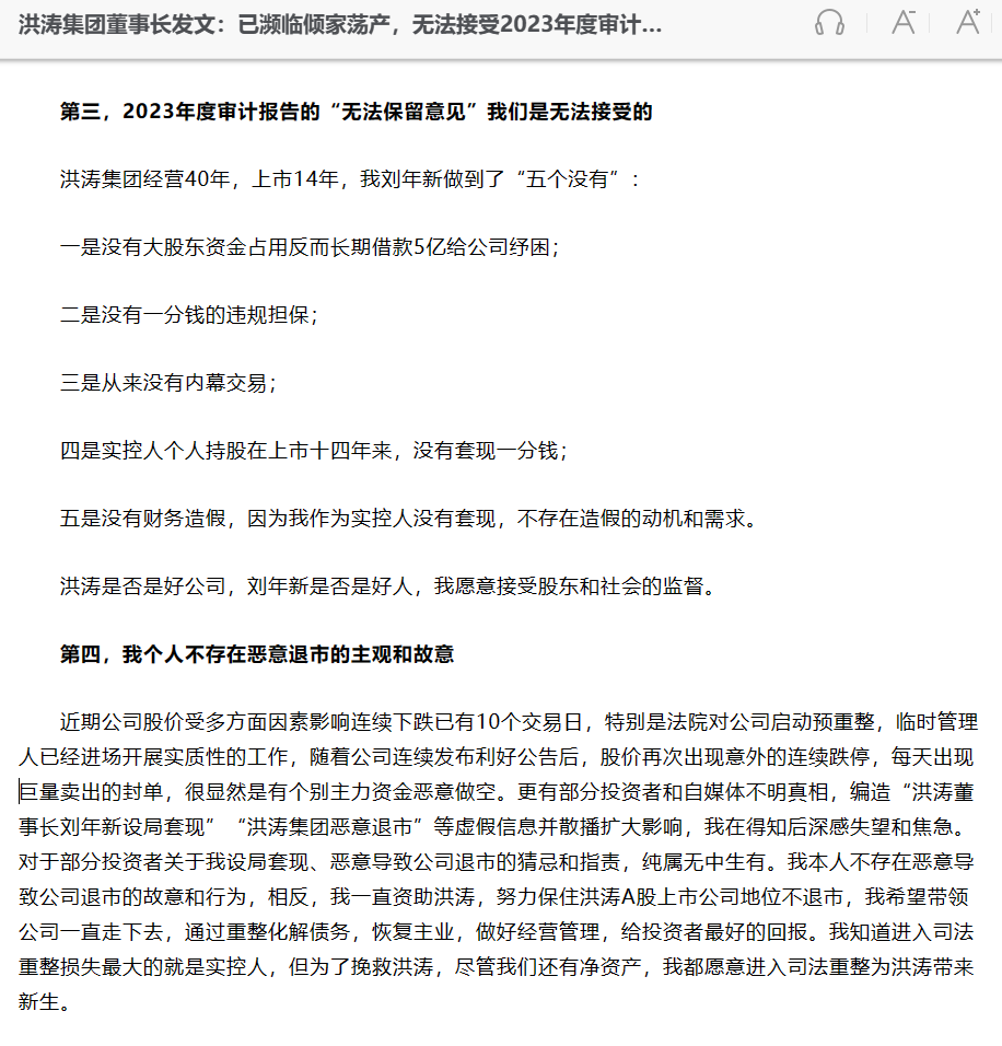 6月17日,洪涛集团董事长刘年新发布公开信鸣不平,信中提到“自2024年开春以来,洪涛集团的危机再次升级,遭遇主力资金恶意做空,面临值退市风险及潜在其他风险等”信中称,刘年新还向亲朋好友借钱,将自己的房子和孩子的房产抵押、变卖换来资金,全部投入到洪涛经营。他从未减持个人持有的公司股份“洪涛就像我自己的亲生孩子,我已散尽家财保洪涛”