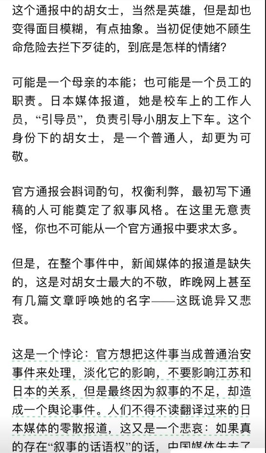 有评论认为,官方通报中刻意回避了“日本人”“校车”等事实真相,恰恰说明了在中国“救日本人”是一个有争议的行为。