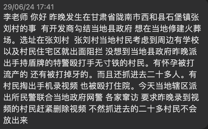 当地县政府想在张刘村修建火葬场, 遭到当地村民阻拦。当晚特警和村民发生争执,有孕妇被被打流产。投稿人称,二十余人被抓。