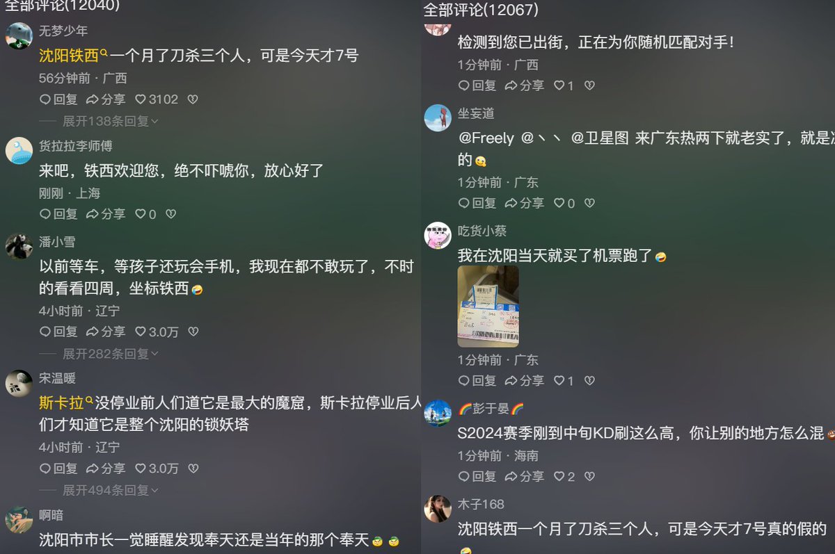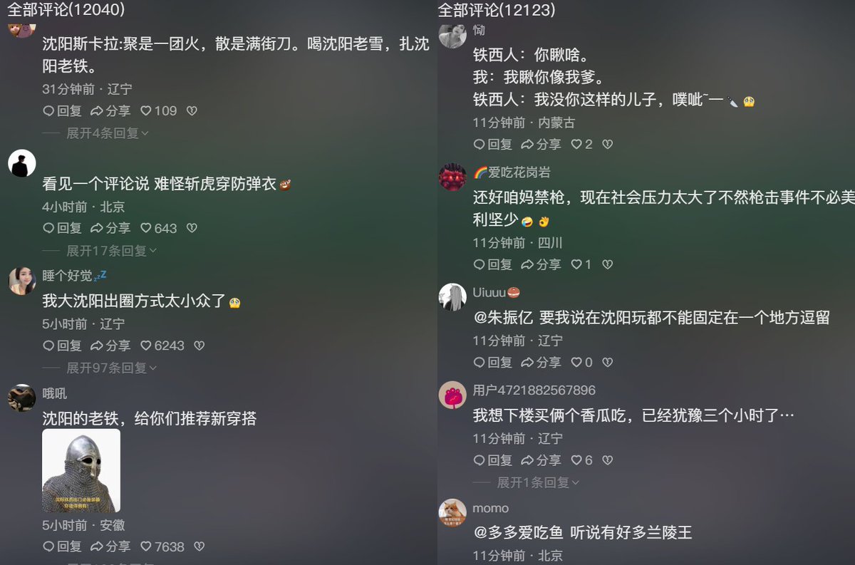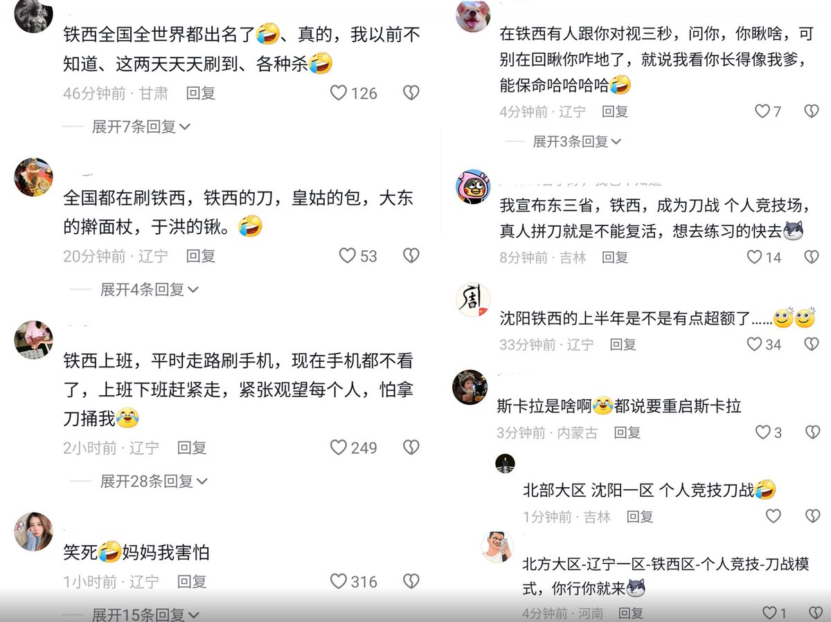 大量网友在评论区留言调侃。一网友回复:铁西大舞台,抗扎你就来,自由小奉天,刀站每一天。 https://t.co/e6S3WwE8o1