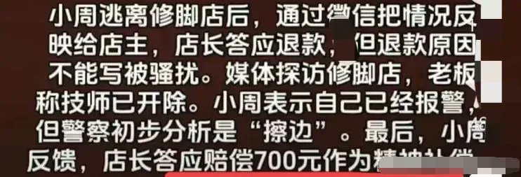 报警后,由于缺乏关键性视频证据,也只能听小周和店内工作人员的各自说辞,后来警方经过分析,足疗店的行为属于“擦边”。