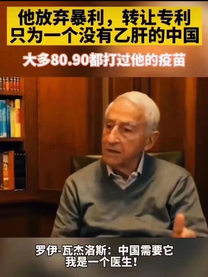 美国默克公司总裁 #瓦杰洛斯 放弃巨大的商业利益,不受国界和意识形态的束缚,赔钱以700万超低价将乙肝疫苗技术转让给中国,让该病毒在中国彻底绝迹。