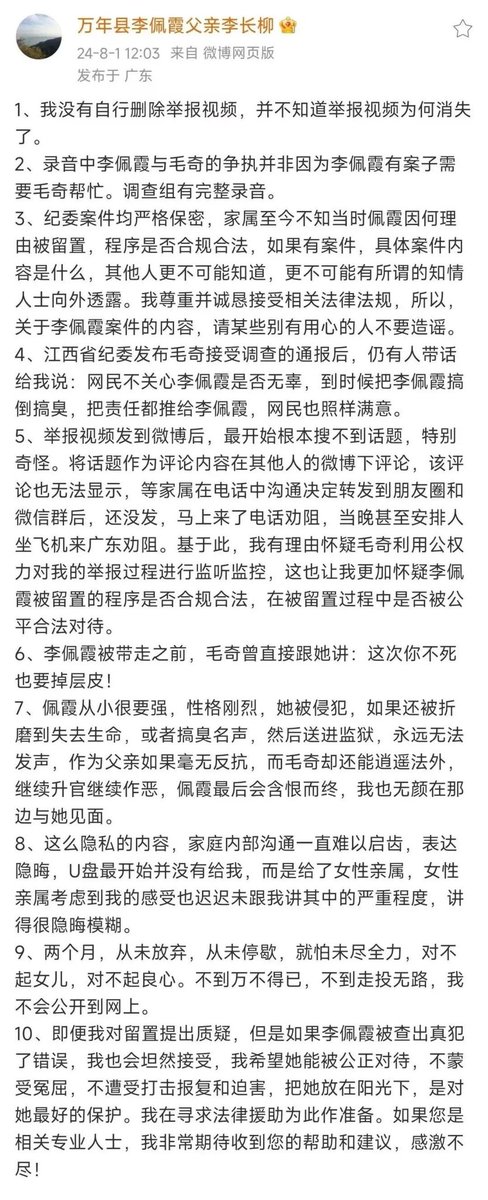 10条声明中,每一句都体现了他对自己女儿李佩霞的担忧之情。