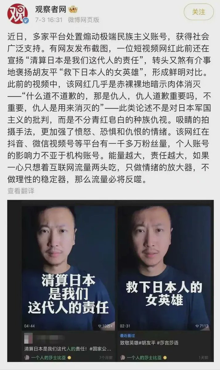 “一莎”被封,起因于“苏州日本母子遇袭案”,开始是没底线、不分青红皂白的种族仇视,宣扬极端民族主义。之后,极速掉头、人格分裂地褒扬胡友平为救下日本人的女英雄。