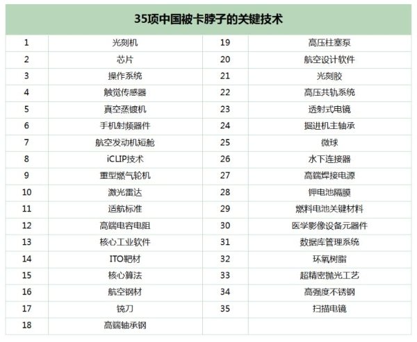 说起被卡脖子的关键技术,很多人都只知道有光刻机和芯片,其实远不止这些关键技术,所谓35项“卡脖子”关键技术,列表如下。