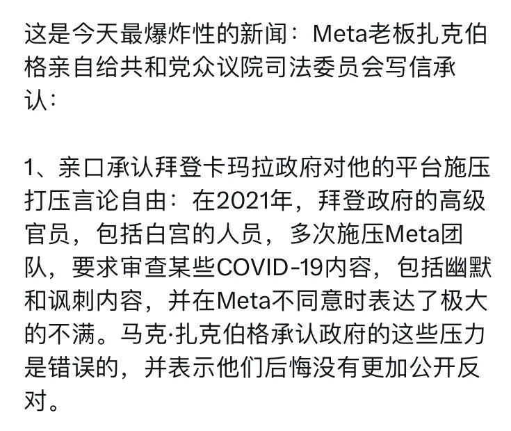 脸书CEO扎克伯格实名检举:拜登政府对美国人民进行言论审查周一,Meta CEO扎克伯格在给众议院司法委员会的一封信中表示,他之前未能更公开地谈论与删除COVID-19内容有关的「政府压力」,表示遗憾。