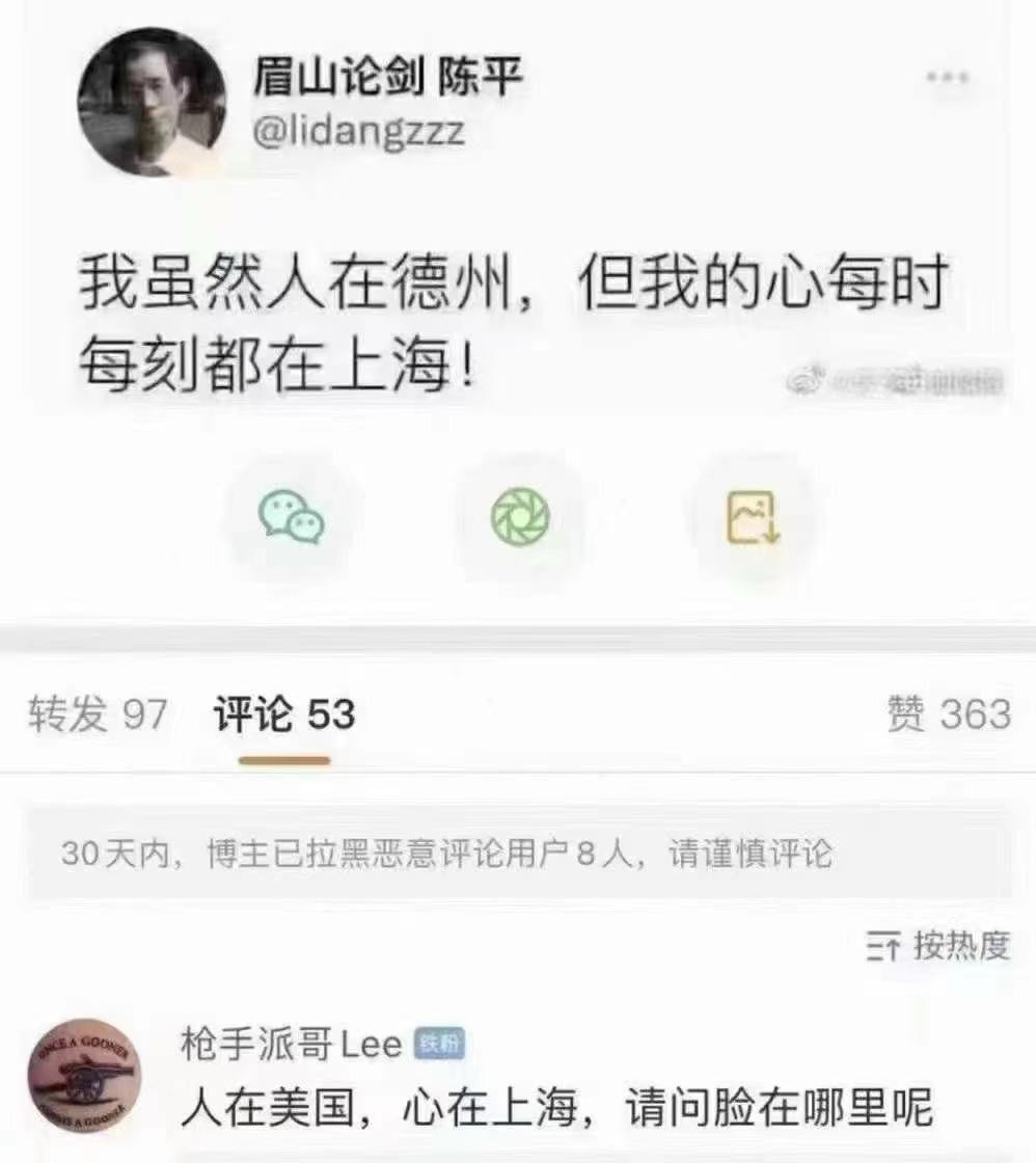 一个叫做中國人的陳平說:「雖然我住在德克薩斯州,但我的心永遠在上海。」