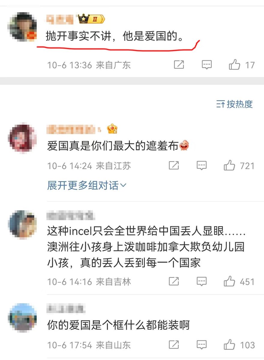 以爱国的名义,干的全是下流龌龊的事,干的全是抹黑中华民族的事。这种不以为耻,反以为荣的人渣,还嫌少吗?爱国已成了流氓耍无赖时的遮羞布,成了恶棍干坏事的挡箭牌!