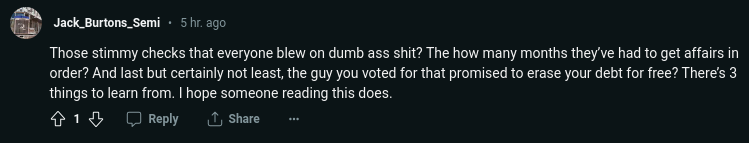 nostr:npub15fkerqqyp9mlh7n8xd6d5k9s27etuvaarvnp2vqed83dw9c603pqs5j9gr funny enough I remember seeing a libertarian video by reason I think it was that said a lot of that stimulus money went to existing debt pay off surprisingly