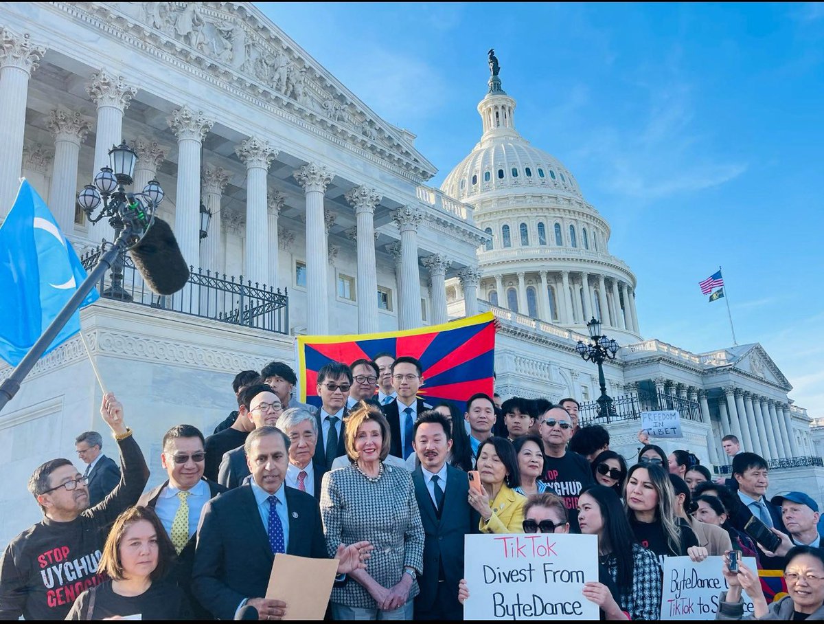 今天藏、维、港、台、汉等受中共迫害的各人权团体在国会山集会,与国会议员佩洛西等一起支持美国国会即将通过的禁止TikTok 的相关法案