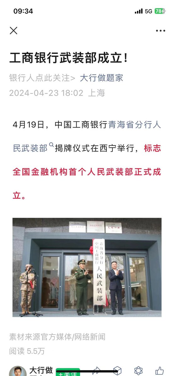 4月19日中国工商银行青海省分行人民武装部。揭牌仪式在西宁举行,标志全国金融机构首个人民武装部正式成立。