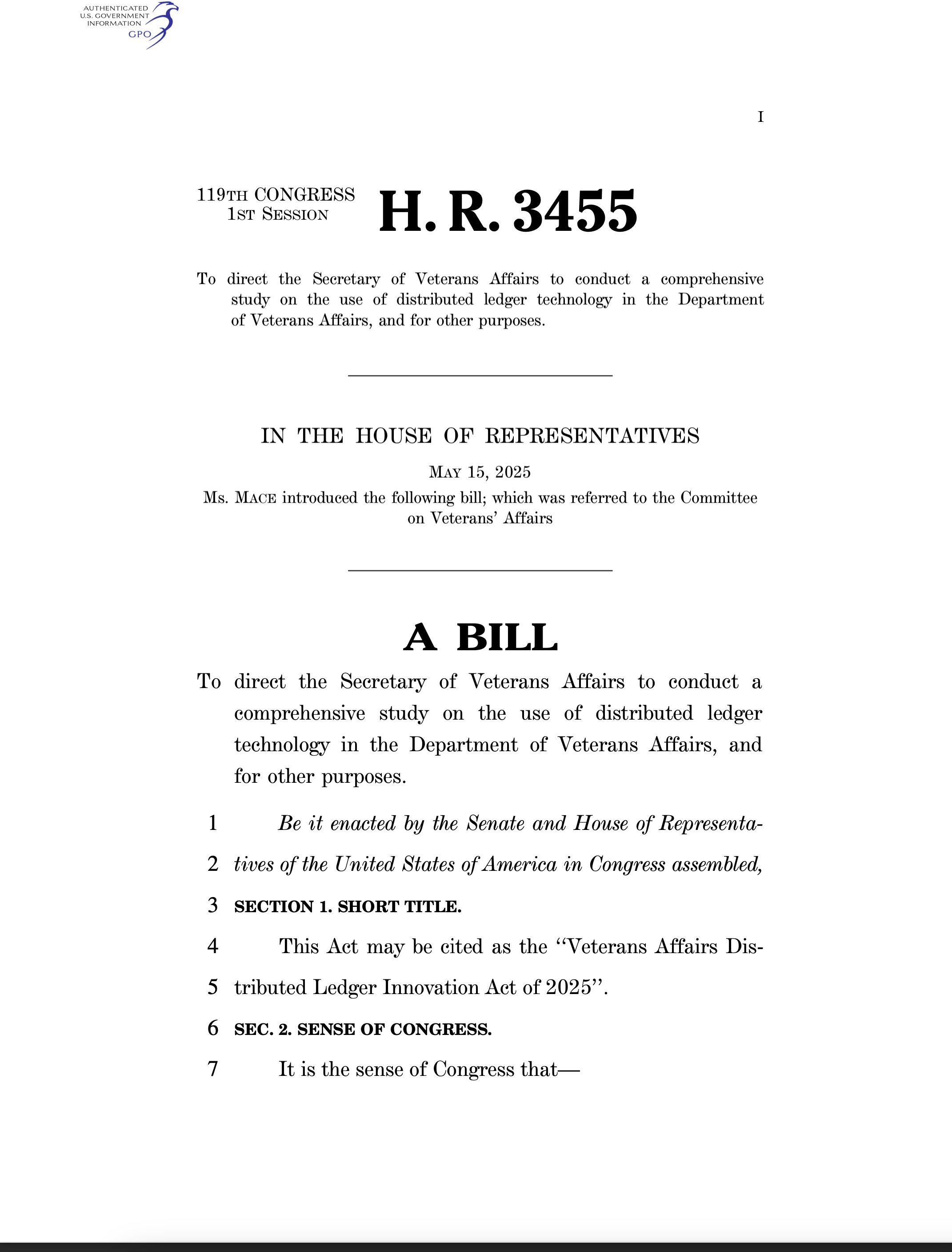 Congress introduces bill to study the use of "distributed ledger technology to modernize Veterans Affairs.