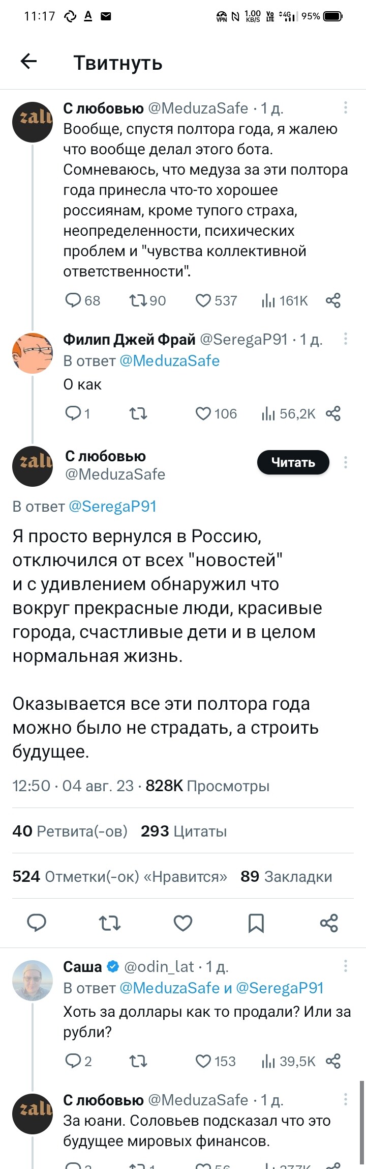 Но забавное совсем не это. Этот же товарищ с тем же хэндлом отписался, что потратил 1.5 года зря, что "Медуза" лишь травмирует психику, что он вернулся в Россию, отключился от новостей и понял, как же тут хорошо...