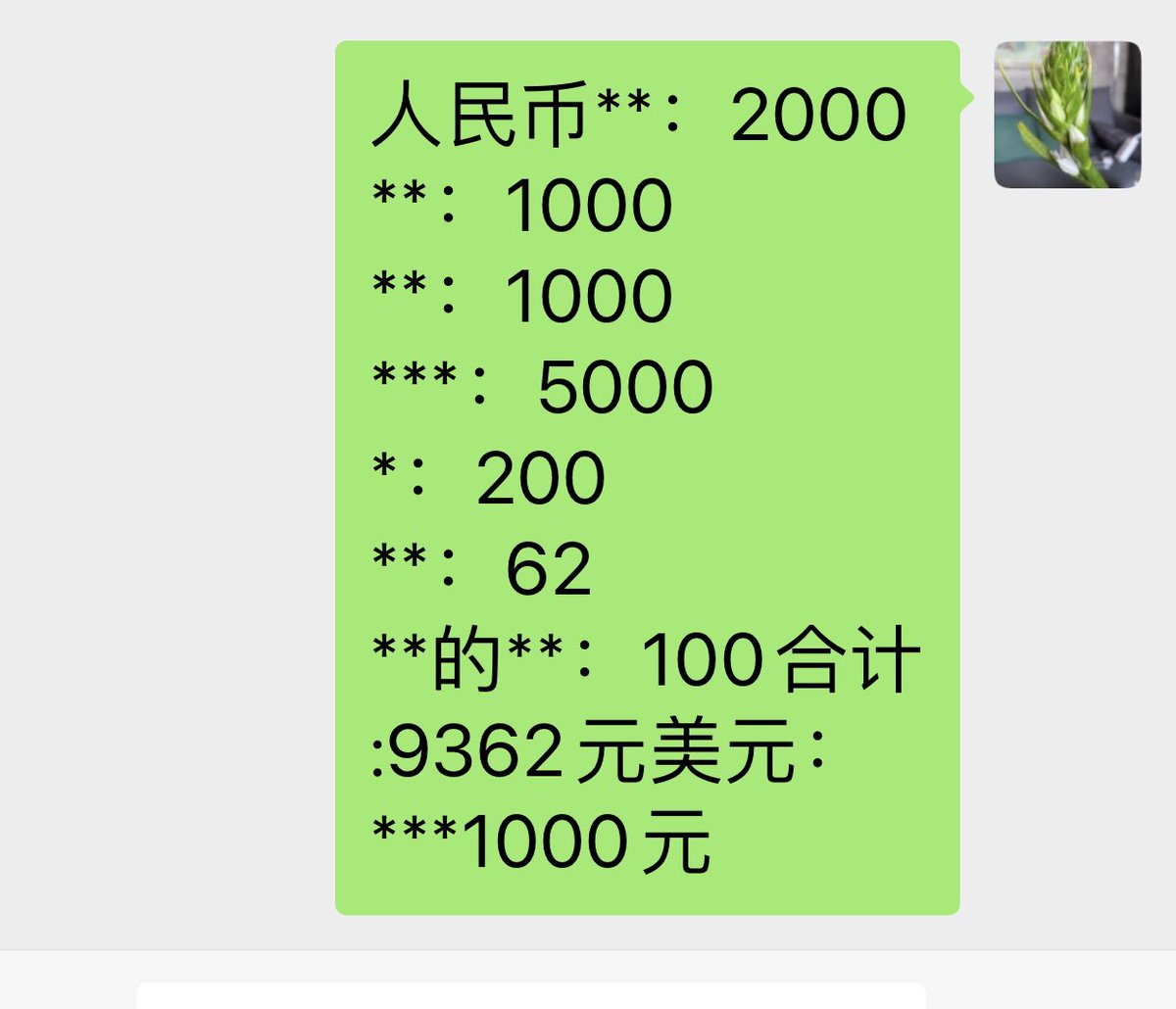 借钱的情况知会一声,此推也可作为凭证。美元收到1000元,人民币9362元。