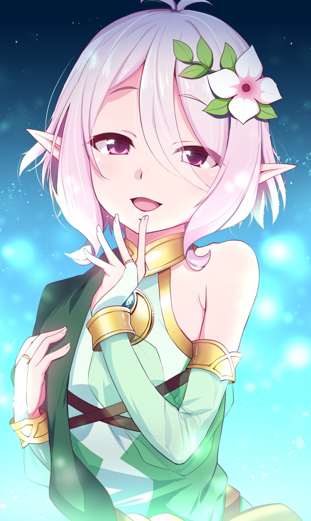 Tags: 1girl :d antenna_hair bare_shoulders blush bridal_gauntlets check_commentary commentary_request detached_sleeves dress elf fingernails flower green_dress green_sleeves hair_between_eyes hair_flower hair_ornament kokkoro_(princess_connect!) long_sleeves natsumi_akira open_mouth pink_hair pointy_ears princess_connect! puffy_long_sleeves puffy_sleeves purple_eyes see-through see-through_sleeves short_hair sleeveless sleeveless_dress smile solo upper_body white_flower