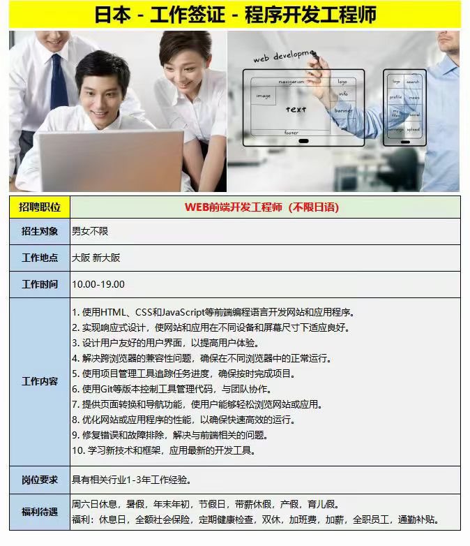 要求:全日制大专学历,女性 35岁以下,给技术人文知识国际业务签证,可以长期在日本工作,企业提供住宿,水电自理。