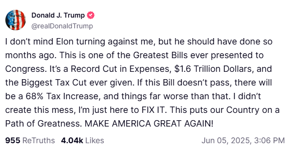 Trump, meanwhile, posted what could be considered somewhat of an attempt to de-escalate - that he 'doesn't mind Elon turning against me, but he should have done so months ago," adding "This is one of the Greatest Bills ever presented to Congress. It's a Record Cut in Expenses, $1.6 Trillion Dollars, and the Biggest Tax Cut ever given."