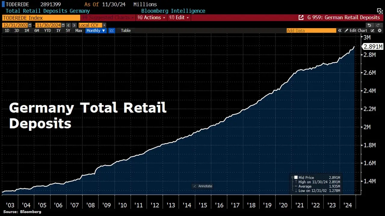 German savers are on a record hunt: they have just reached a fresh all-time high with 2.81 billion euros in bank deposits. The fact that European banks in particular may be poorly capitalized does not matter to these people. The next wave of inflation will hit them like a bolt from the blue. #germany #inflation #bitcoin #fiat https://files.sovbit.host/media/863f2c555276e9ed738933b0efee6b021042f16e1529dd755704885b87fee183/d201dd4cf70a692bf4065f0956aadfb00476d50ba087cd82a6079659b8ee18bc.webp