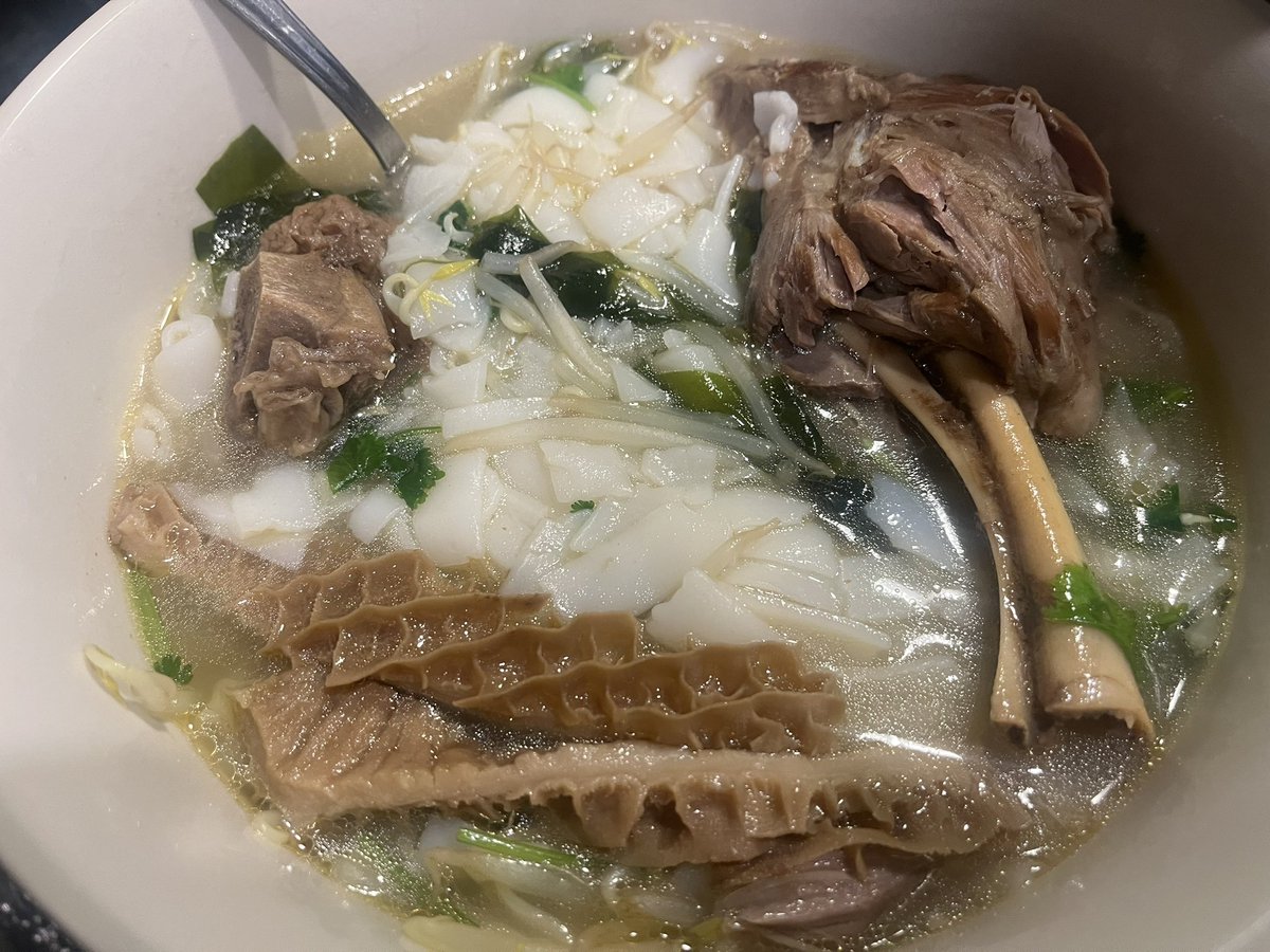 早上本来想做个炒河粉,准备妥当了,才发现儿子昨晚留了纸条说早晨想吃羊肉汤面。那就羊肉汤河粉吧。 https://t.co/MRyUTE6j1s